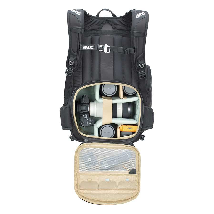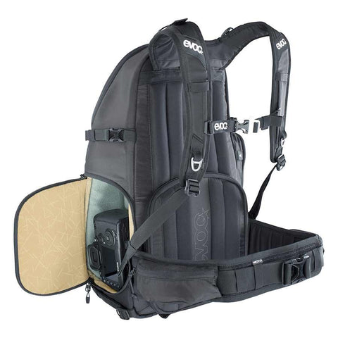Rapid access to the camera from the side. Perfect positioning and optimal air circulation. Belt system for a tripod, poles or ice axe. Integral rain cover. Additional compartments for laptop, hydration bladder, personal items and small parts. Padded, movable internal dividers & straps allows the photographer to carry his camera safely even when things get rough.