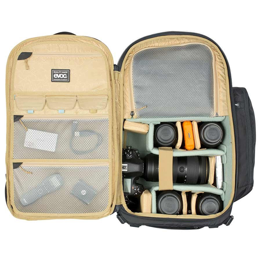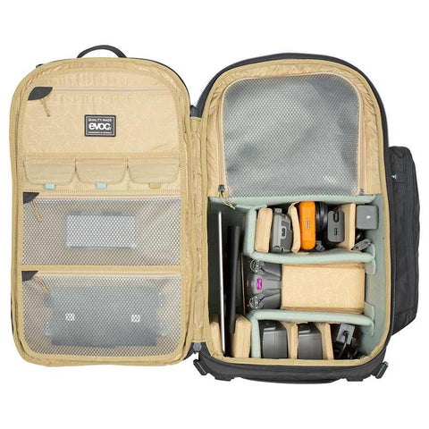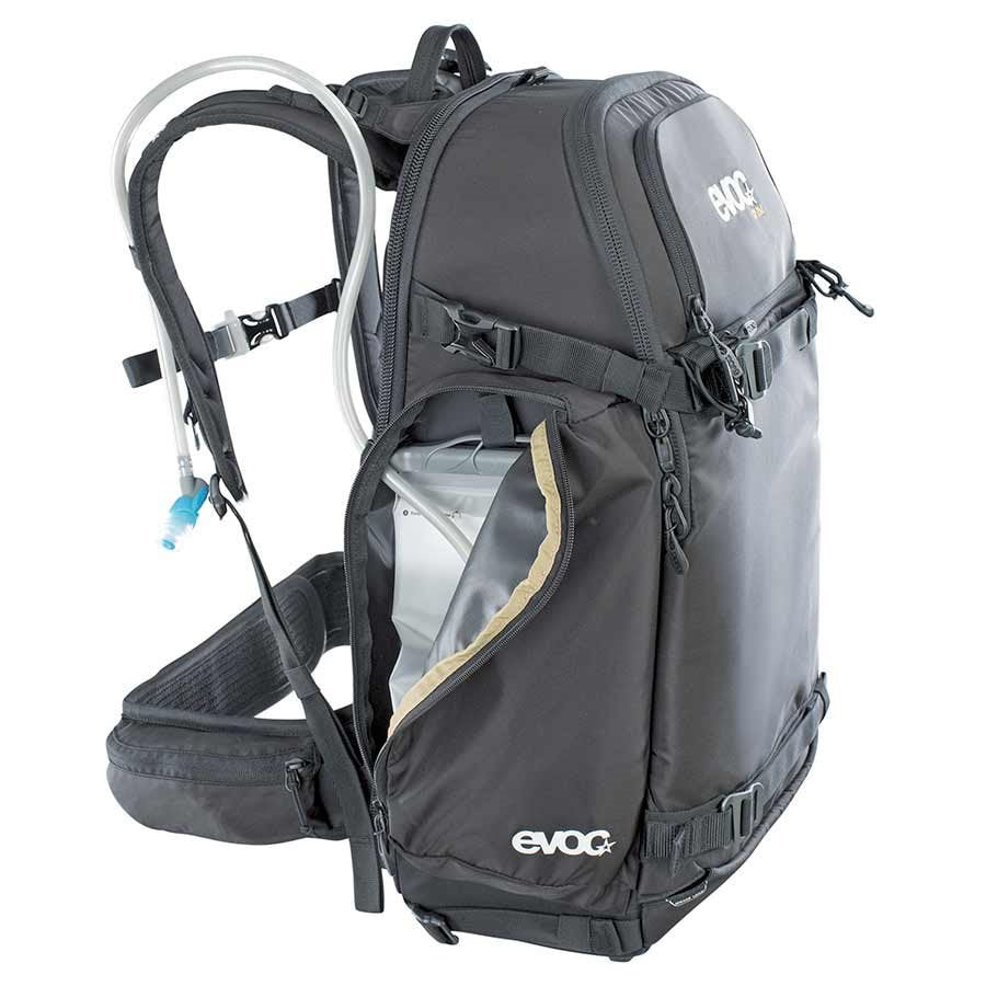 Extra-wide, ergonomically cut and well-padded shoulder belts with a deep cutaway for the neck. Back opening main compartment has 60/40 volume split for the camera compartment/personal items. Suitable for DSLR cameras or smaller drones. Camera can be swiftly accessed from the side. Fastening systems for skis, snowboard, poles, ice picks and tripod. Hip belt pockets for quick-access additional storage. Integral rain cover. Strategically positioned back padding with ventilation channels for maximum air circulation. Extra-wide, height and length-adjustable, detachable elastic hip belt made from AIROFLEX. Additional compartments for personal items, small parts, avalanche equipment, laptop and hydration bladder. Padded, movable internal dividers & straps allows the photographer to carry his camera or drone safely even when things get rough.